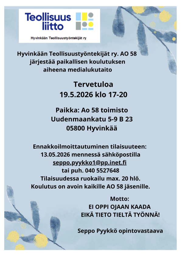 Kannustamme kaikkia jäseniä osallistumaan koulutukseen. Aihe on ajankohtainen ja tärkeä erityisesti tässä ajassa, jossa tiedon luotettavuuden arviointi korostuu. Koulutus tarjoaa hyviä valmiuksia…